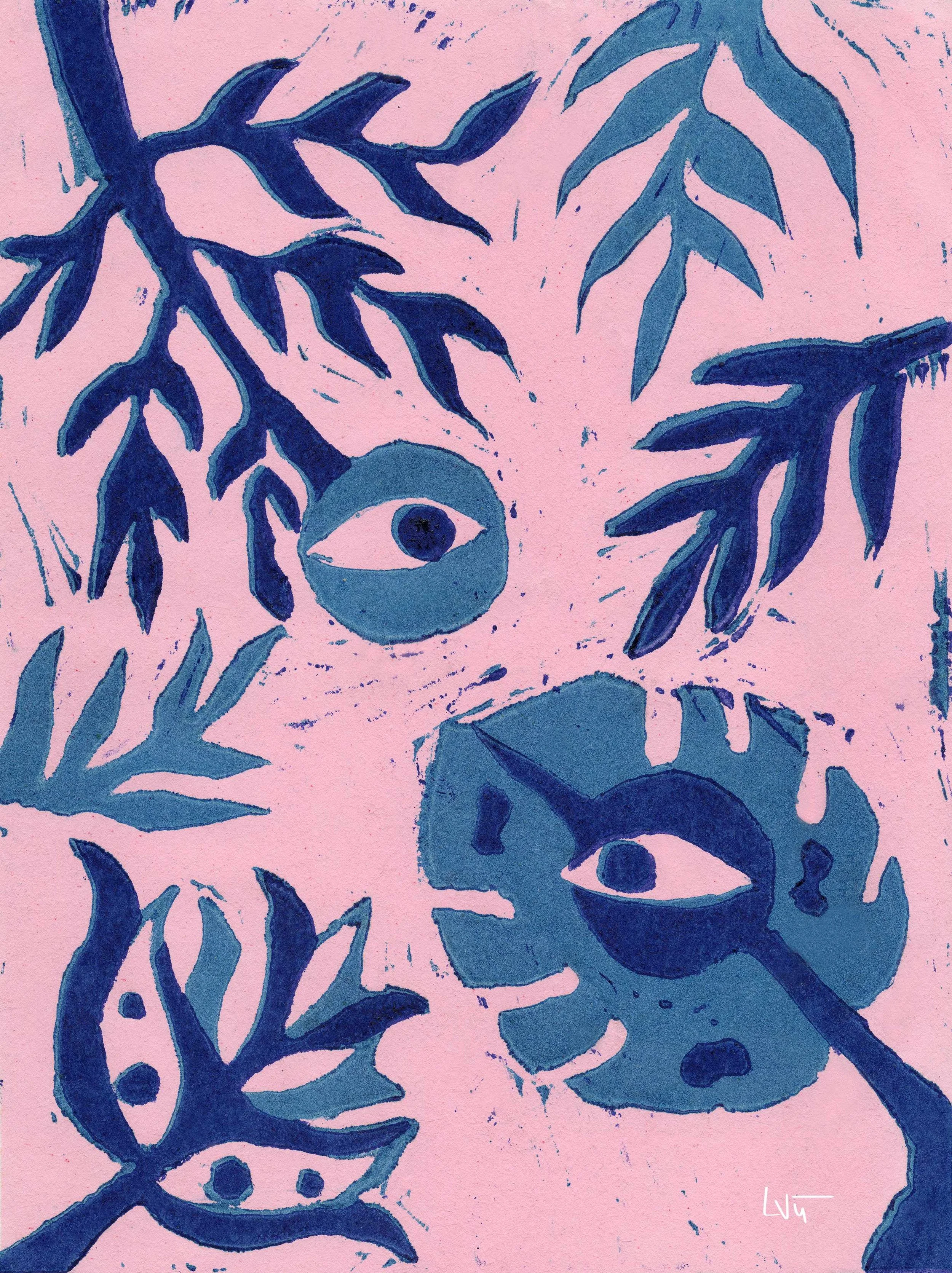Created using the linocut technique, the eye-shaped plant forms are carved into linoleum, with the raised surfaces inked and pressed onto paper to produce the final print.