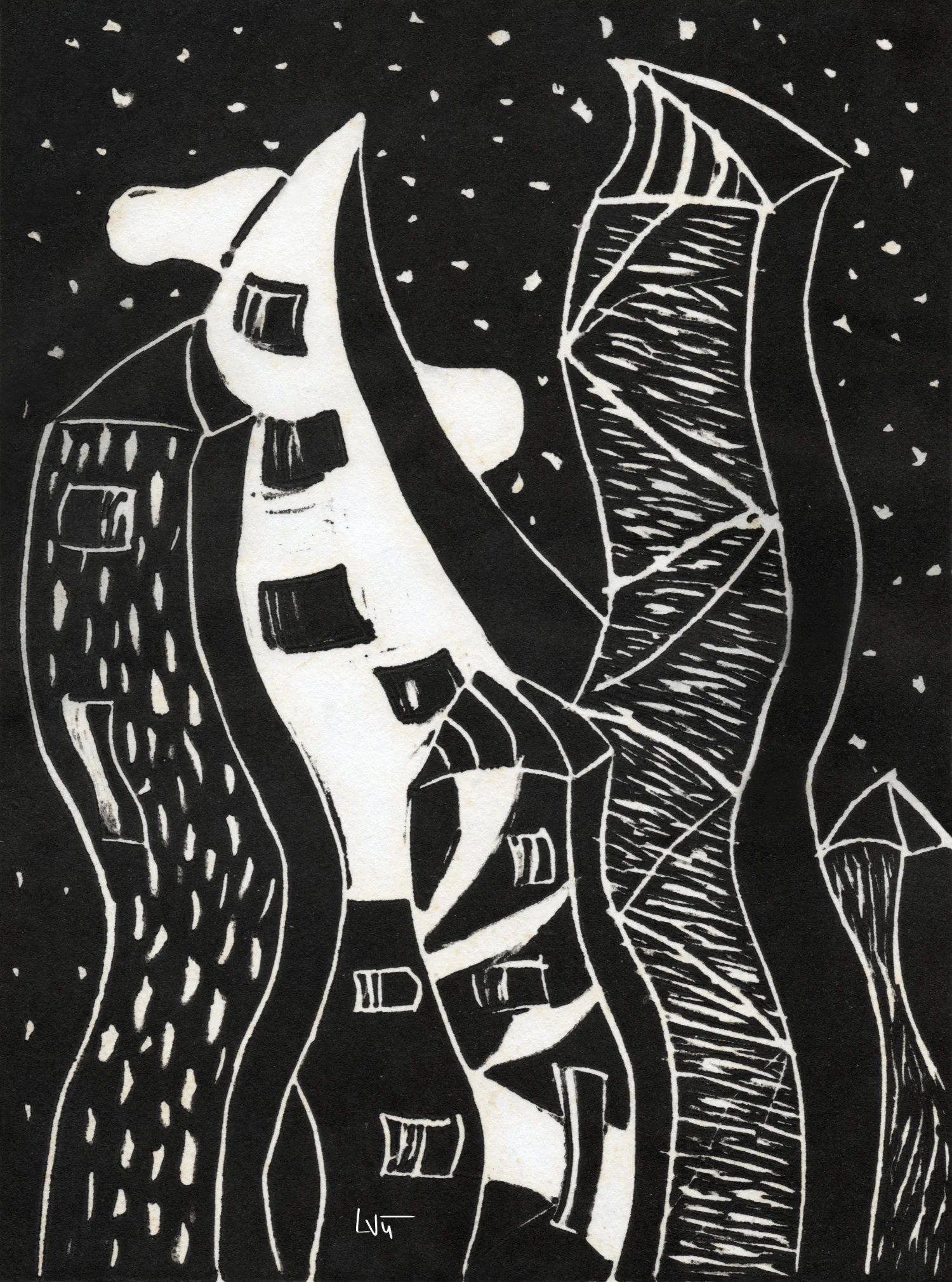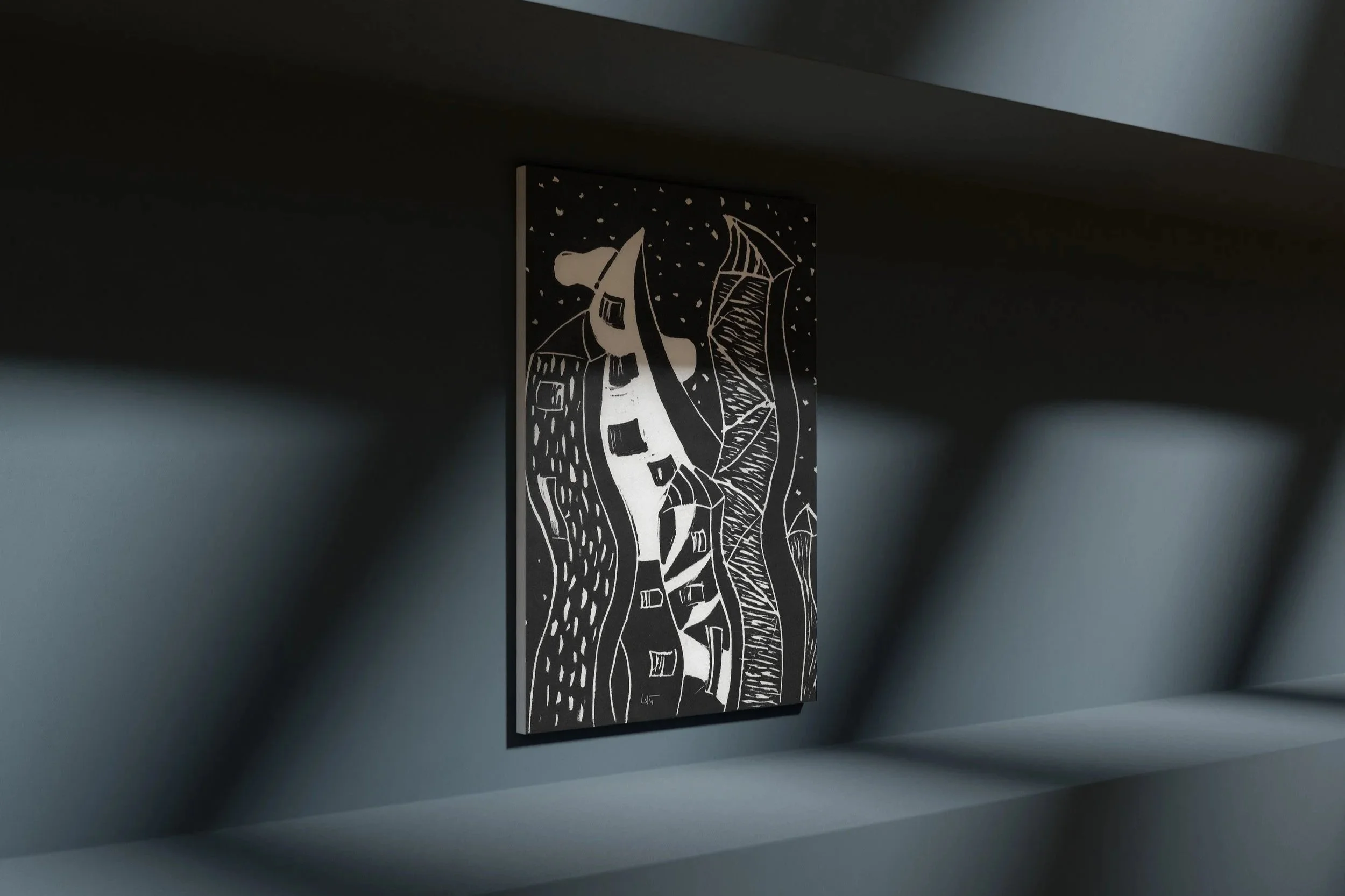 Created using the linocut technique, the cityscape is carved into linoleum, with the raised surfaces inked and pressed onto paper to produce the final print.